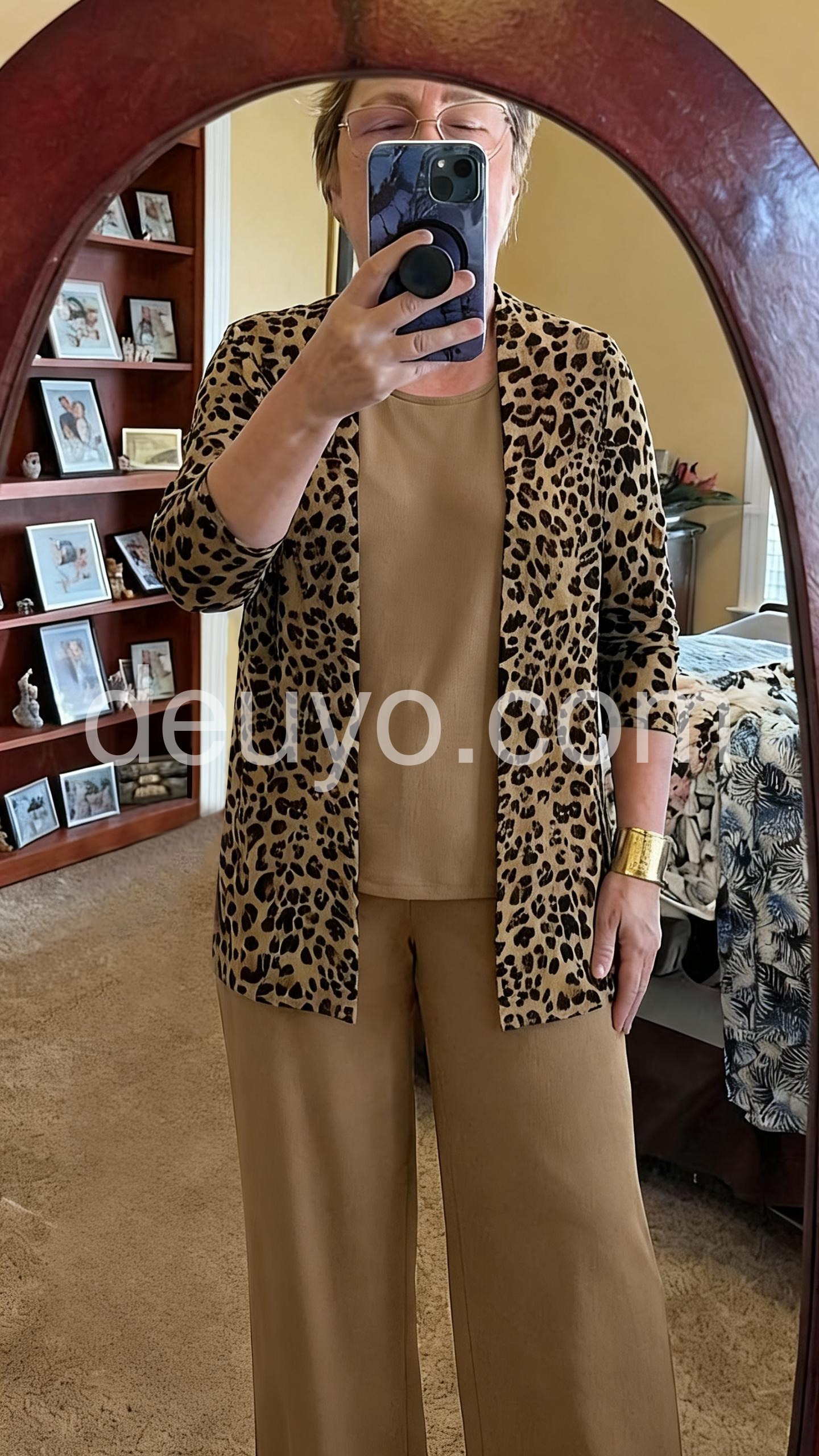 This two-piece set is an absolute staple now. The neutral tone matches everything, and the pop of animal print gives it great personality. Washes beautifully on the delicate cycle. I let it air dry and it looks brand new.