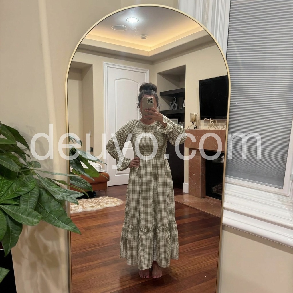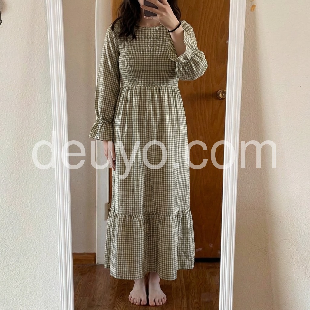 Such a flattering fit! The stretchy top portion makes it fit like a glove, and the skirt flows beautifully when you walk. The green and white check is very subtle and earthy. I paired it with a wicker basket bag just like the model and felt so chic.