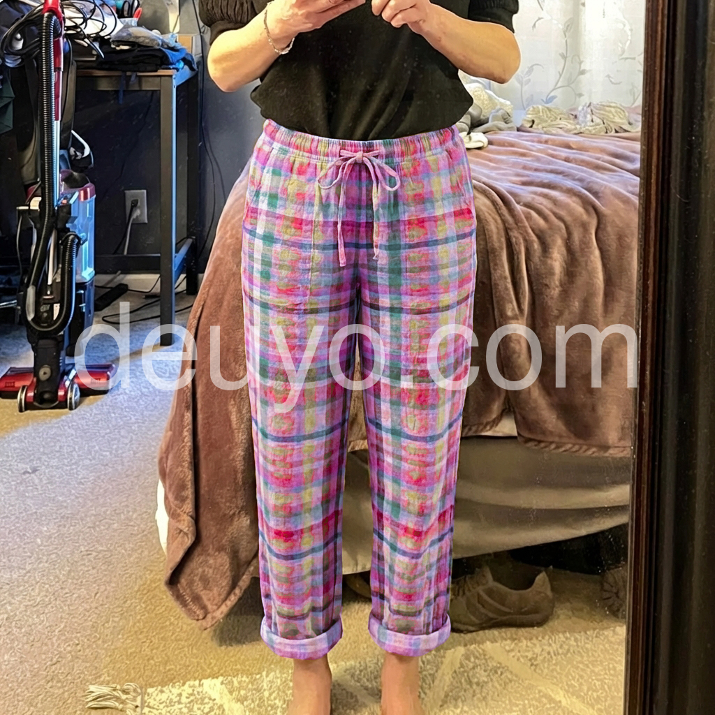 I absolutely love these plaid long pants! The fabric feels soft yet durable, and the colorful pattern makes the whole outfit look cheerful. The fit is relaxed without looking sloppy, so I can wear them to work, errands, or even a casual weekend outing. They also pair perfectly with simple tees and sandals—definitely a new favorite in my closet.