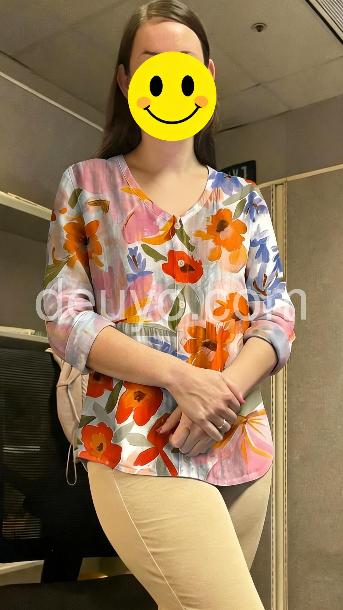 This long-sleeve blouse features a vibrant watercolor floral print in soft pinks, oranges, and blues. The V-neck and button-down front add a classic touch. Lightweight fabric perfect for spring and summer. Pair with jeans or skirts for a fresh, casual look. Effortlessly stylish and comfortable.