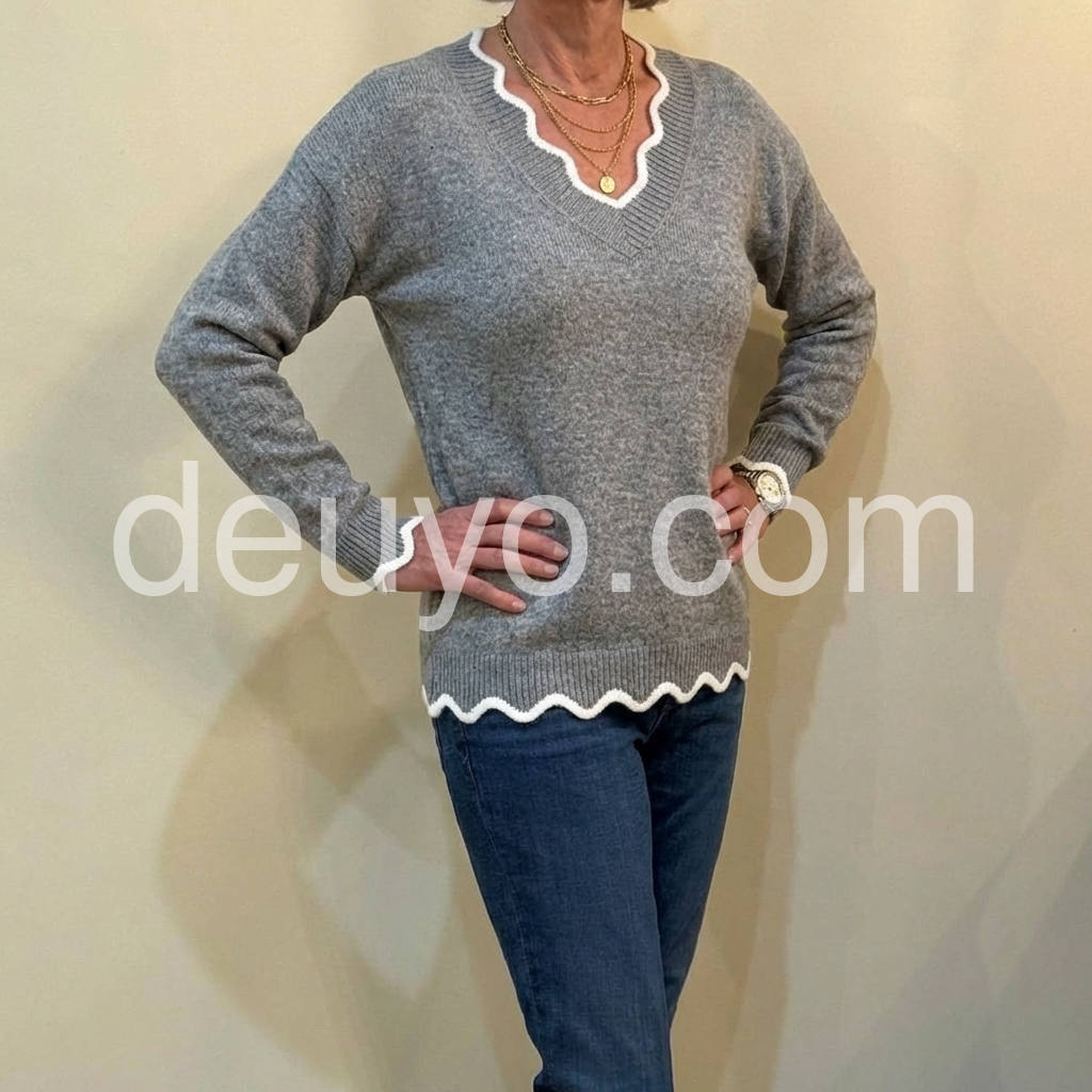 I absolutely love this sweater—it's so soft and comfortable, and the V-neck design looks flattering on everyone. The ribbed cuffs and hem with the little contrast trim add such a cute, polished touch. I’ve already worn it multiple times and it still looks great!
