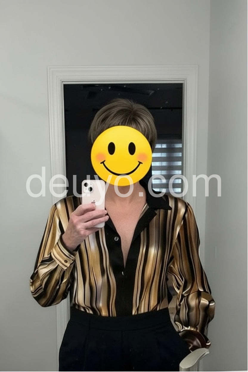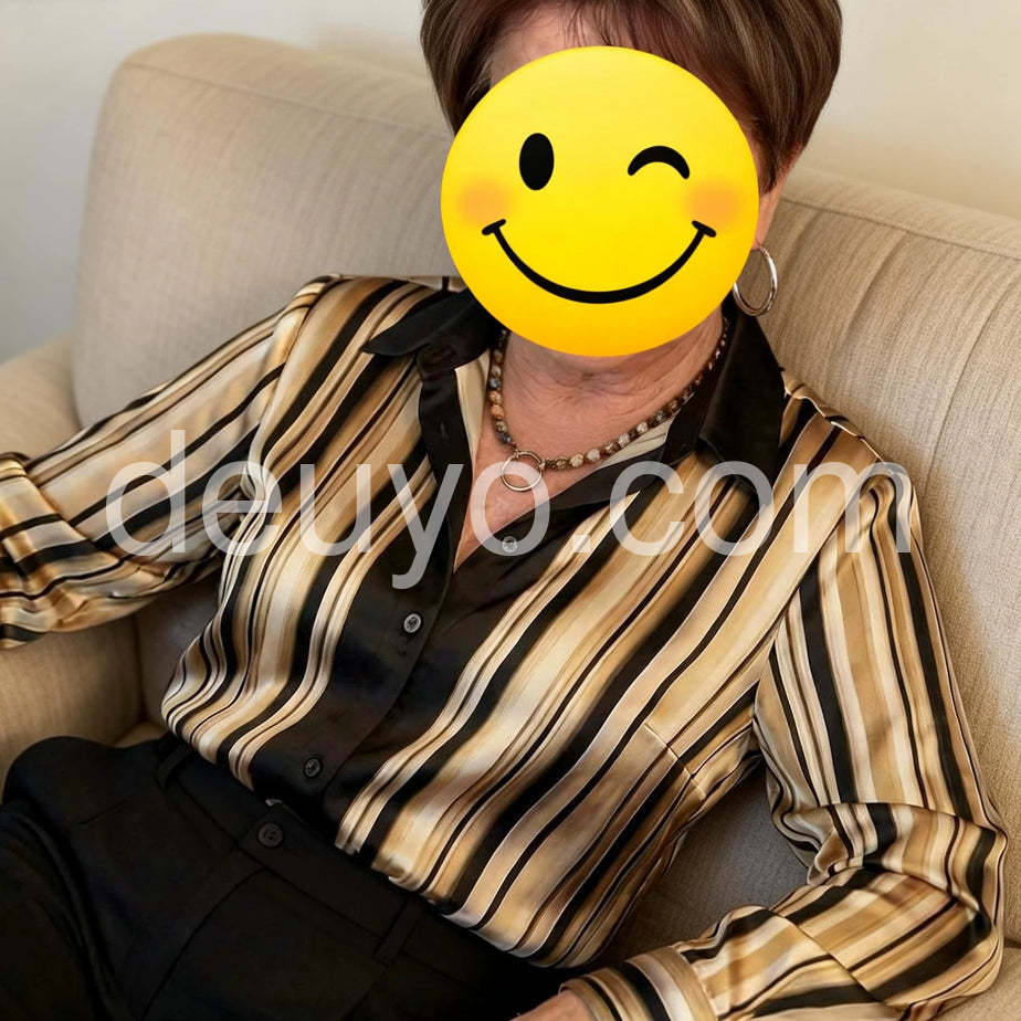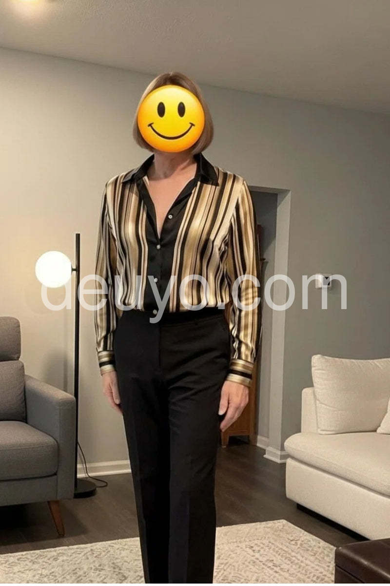 I am absolutely loving this striped blouse! 😍 The fit is fantastic, and the fabric feels so luxurious against my skin. It looks incredibly chic! ✨ Definitely a new favorite in my wardrobe. Highly recommend! 👍\"