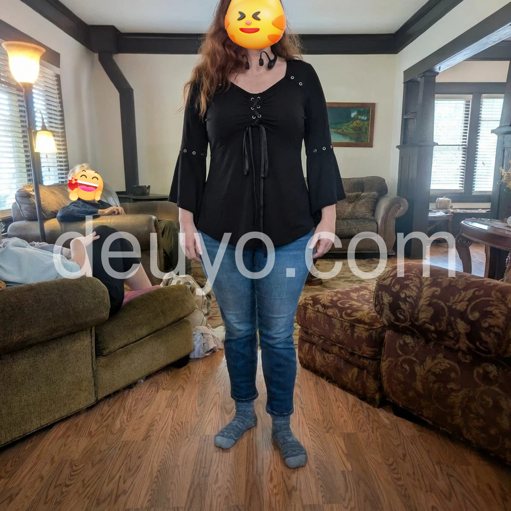 This top is exactly what I needed for a night out! The V-neckline is flattering, and the lace-up ribbon makes it look so elegant. The bell sleeves are flowy and don’t restrict movement at all. The fit is true to size, and the asymmetrical hem adds a stylish touch. I will definitely be wearing this on repeat!