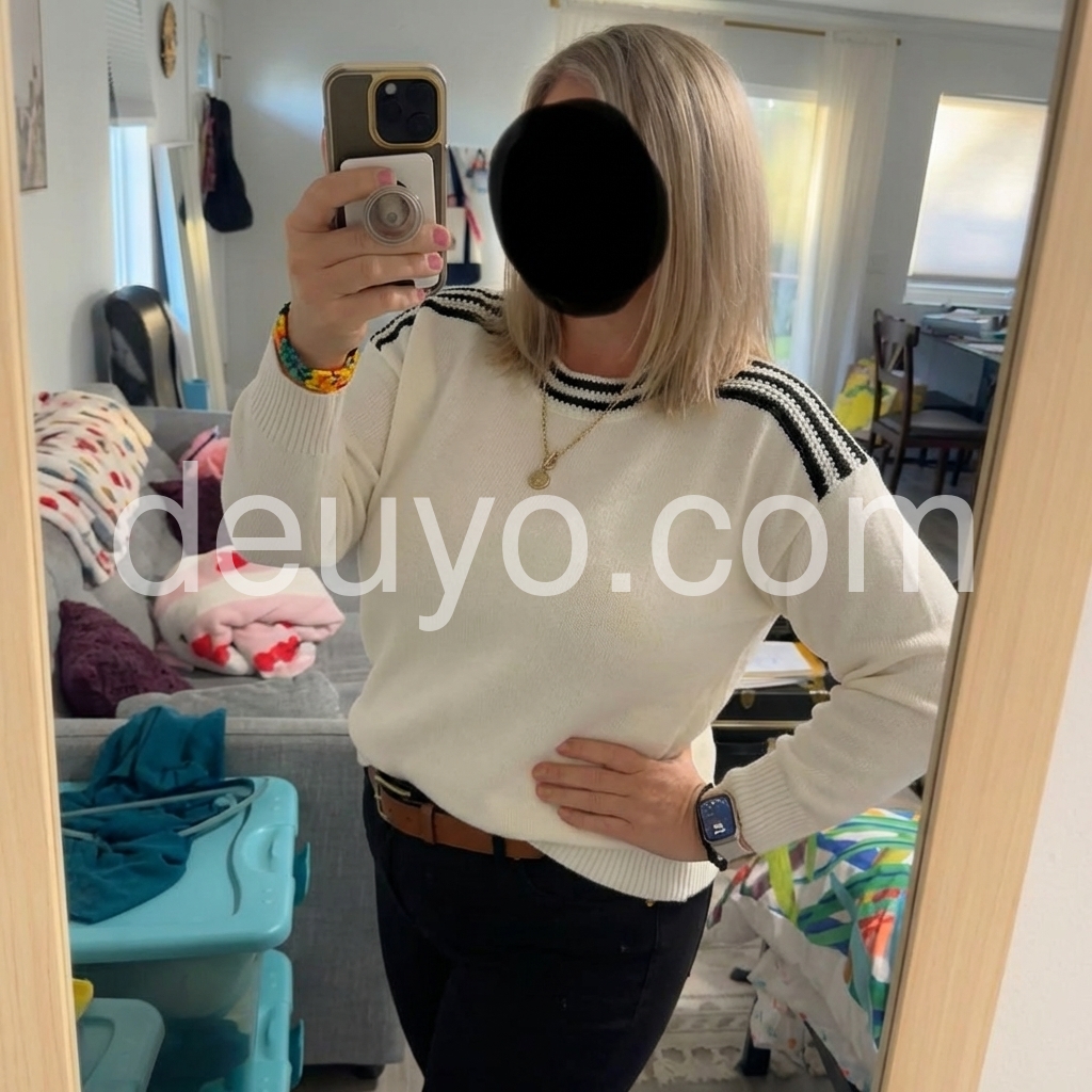 This sweater is a perfect blend of comfort and style. The black-and-white striped neckline gives it a distinctive, classic look, and the plain white body makes it easy to pair with almost anything. The knit fabric feels smooth and cozy, and the fit looks really nice on. I’ve already recommended it to a friend!