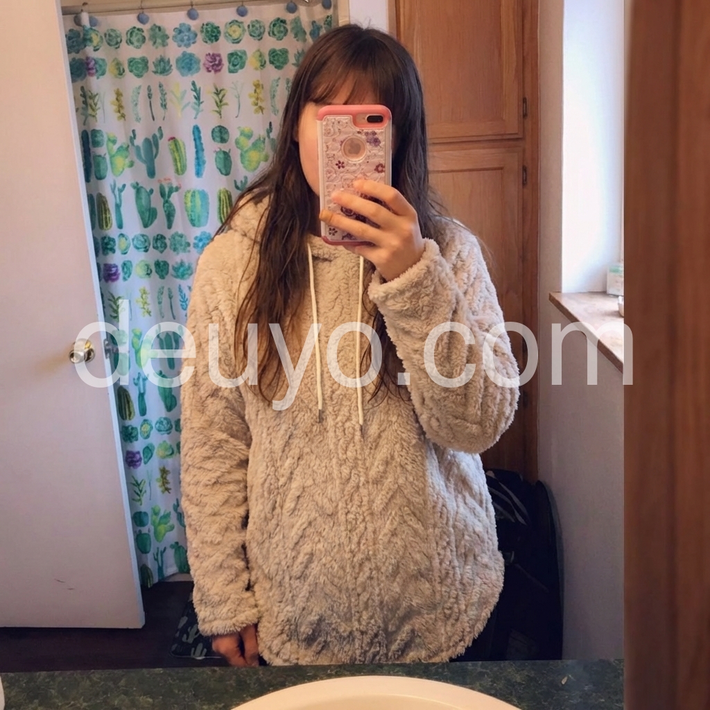 I’m obsessed with this cozy hoodie! The fuzzy material is so soft against my skin, and the thermal lining keeps me warm without being bulky. The relaxed fit is flattering and forgiving, great for lazy days or running errands. The hood with white drawstrings gives it a casual, cute look. It washes well too—no shedding or fading after a few cycles. My new go-to for chilly days!