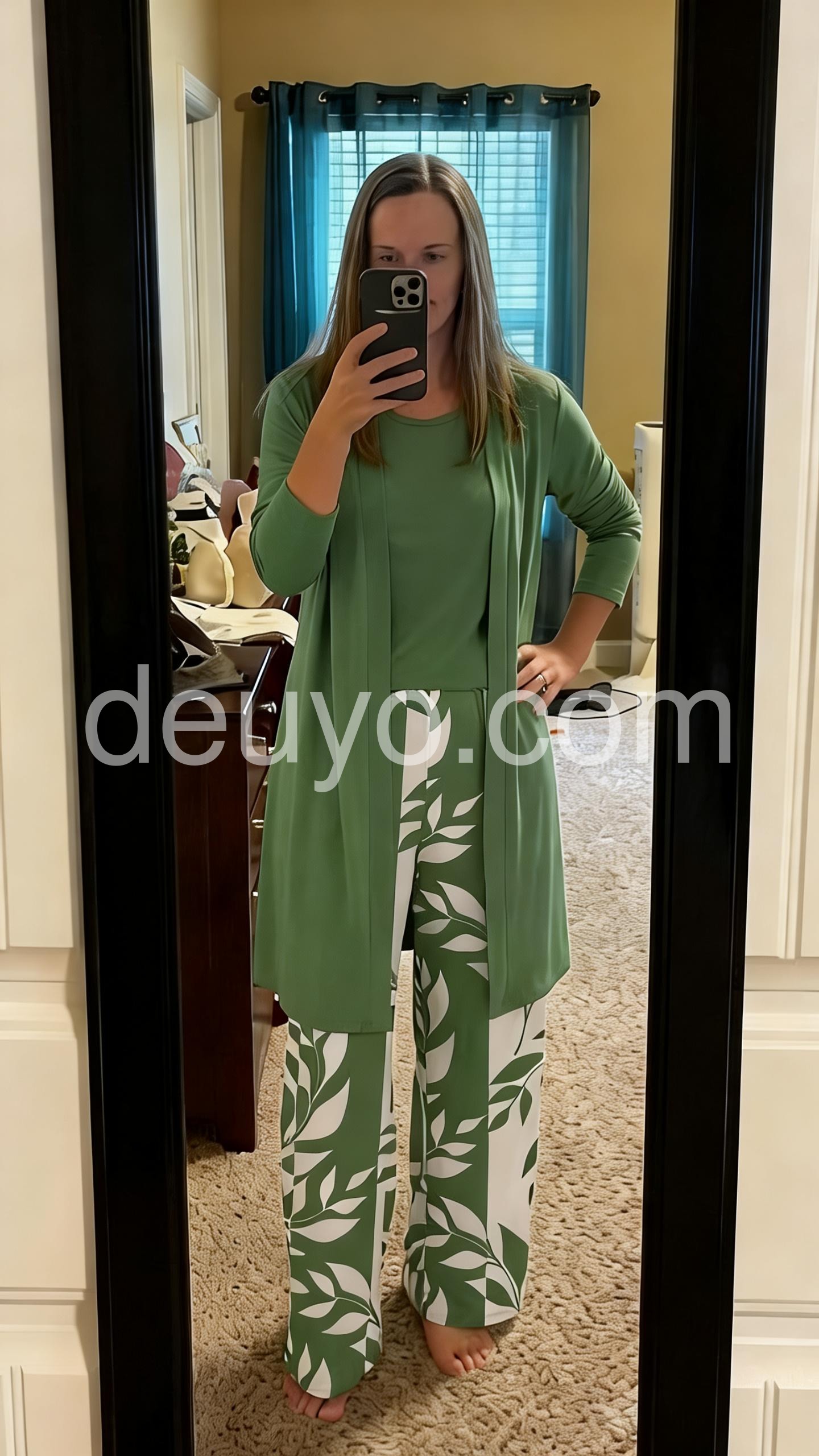 Such a unique design! I love how the top looks like a layered cardigan over a shirt, but it is all one easy piece. The matching pants tie the whole look together. Very chic and unbelievably comfortable for all-day wear.