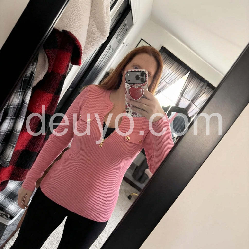 Sweet Pink Plain Zip V-Neck Knit Top