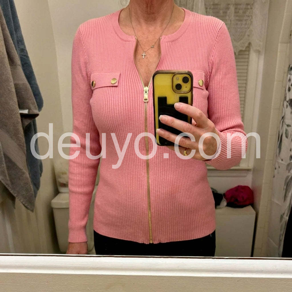 Elevate your wardrobe with our Sweet Pink Plain Zip V-Neck Knit Top. The soft knit material's luxurious feel makes it perfect for all-day comfort, while the modern V-neck and zip design adds a touch of sophistication. Upgrade your style with this classic and versatile top.