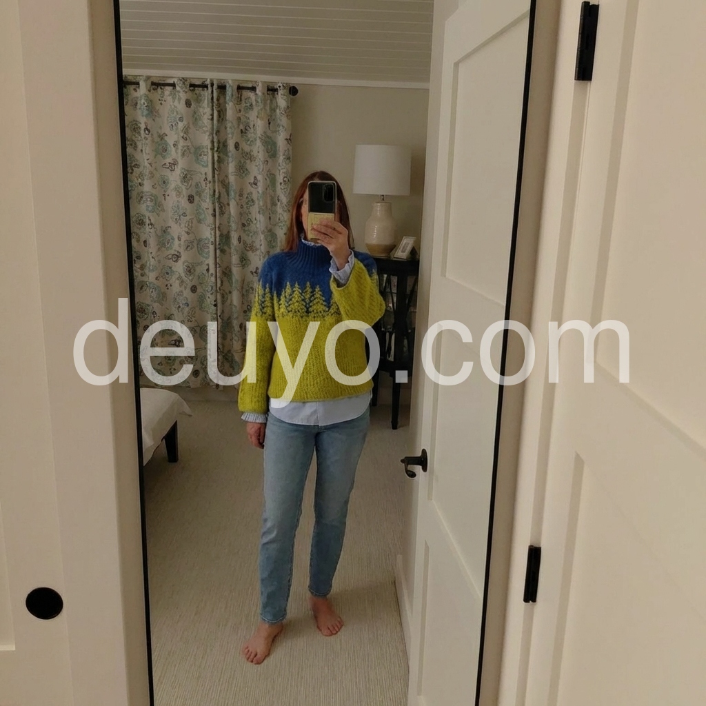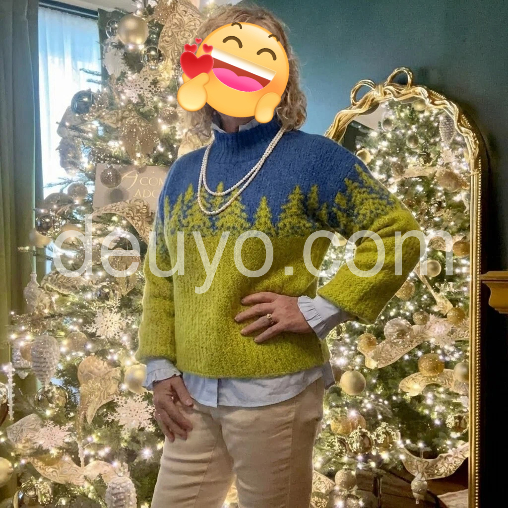 Great purchase! This sweater is incredibly soft and warm, perfect for cold weather. The design is so cute—those little trees are such a sweet detail, and the color contrast is bold but stylish. The bell sleeves are a nice touch, adding a feminine flair without being too frilly. It fits well, not too tight or too baggy, and the high neck is great for blocking out the wind. I’ll definitely be buying more colors if they become available!