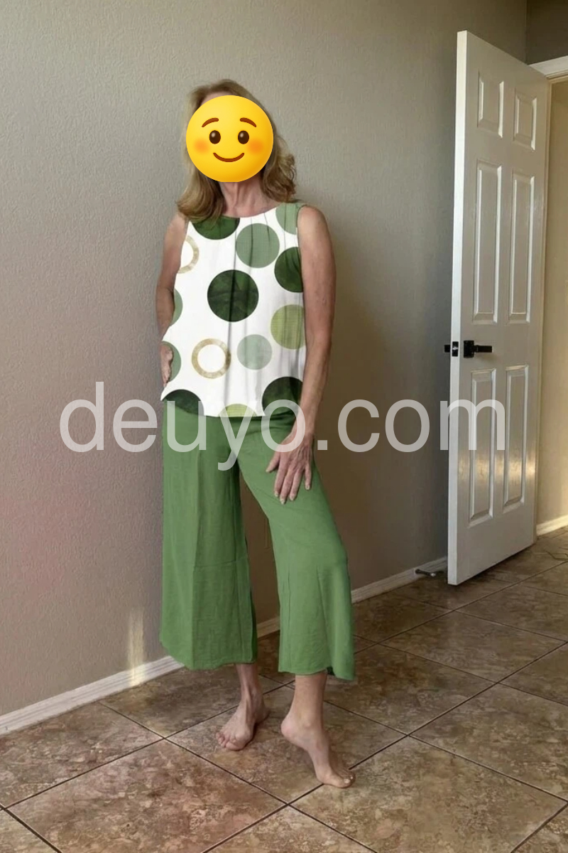 I absolutely love this two-piece set! The green polka dot pattern on the top is so fun and vibrant, and the wide-leg pants are incredibly comfortable. Perfect for a summer vacation or a casual brunch. The material is lightweight and breathable. Highly recommend!