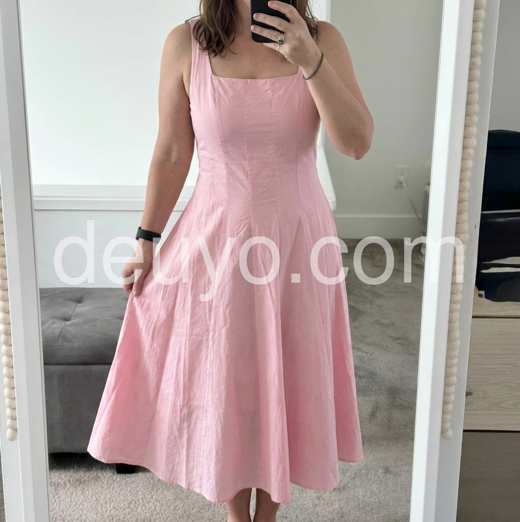 Absolutely love this dress! The light pink color is just as pictured, and the square neckline is super flattering. It fits perfectly around the bust and then flows out nicely. Highly recommend for summer brunches.