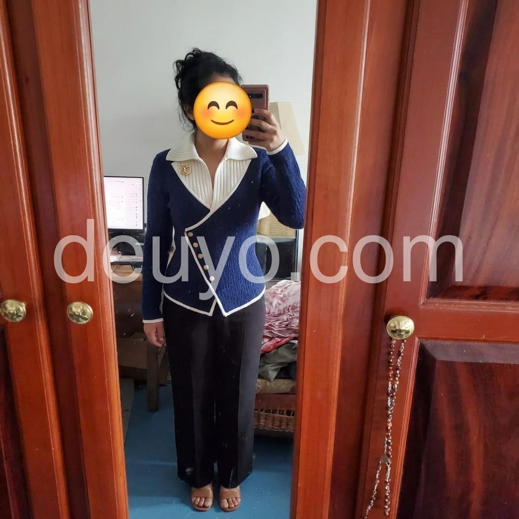 I’m so happy with this purchase. The sweater design is stylish and distinctive, especially with the contrast collar and the gold buttons. It feels soft and cozy, yet still structured enough to look polished. I appreciate how it holds its shape and looks neat even after wearing. Overall, it’s a fantastic item.