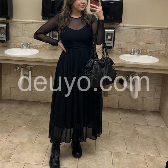 Absolutely in love with this dress! The sheer mesh sleeves give it such a cool, edgy vibe without being too revealing. I wore it to a concert with chunky combat boots just like the model, and it looked incredible. The material is surprisingly soft and flows beautifully when you walk.