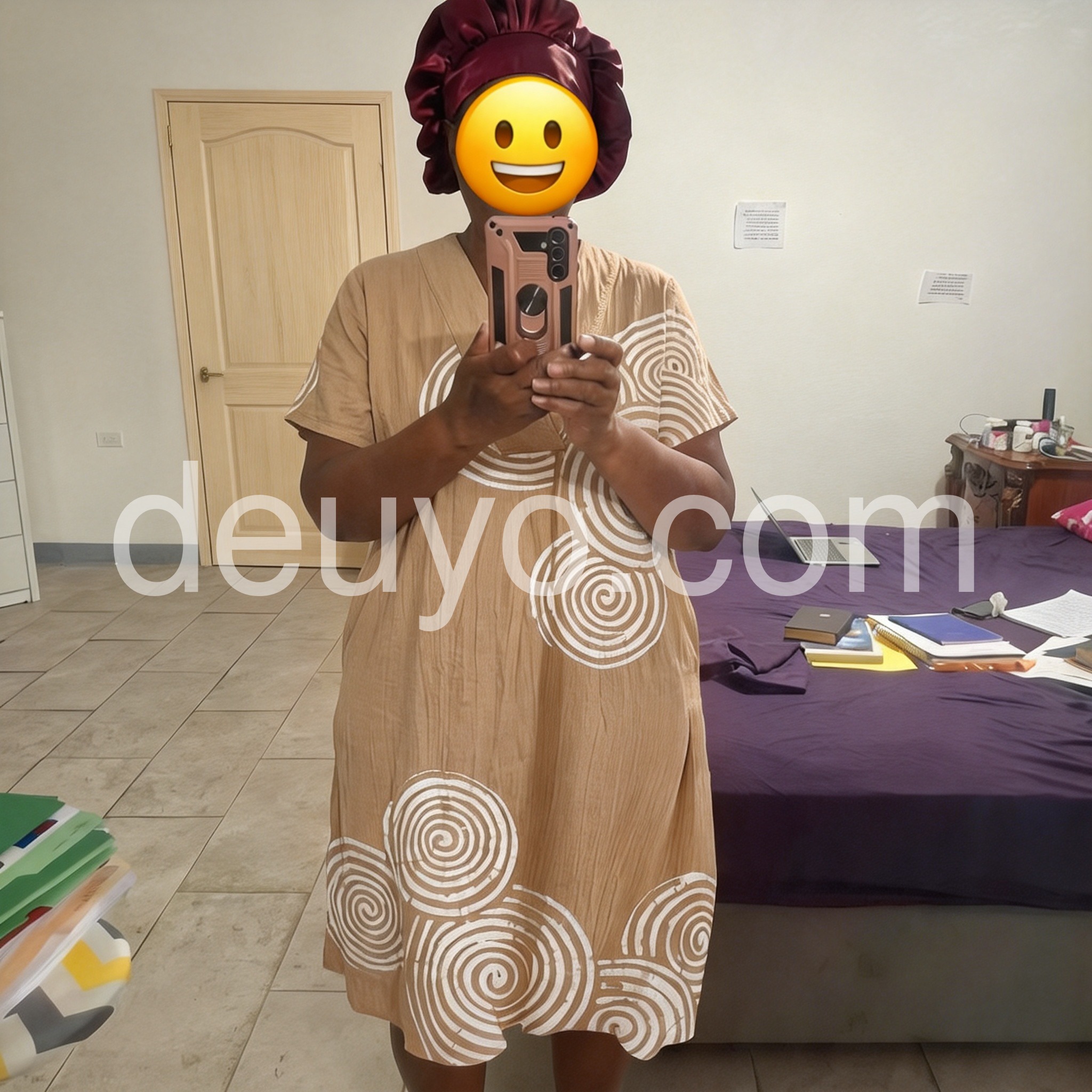 Love this breezy tan dress for summer getaways. The soft fabric drapes beautifully and the circular white print adds a chic, coastal vibe--perfect with the woven bag for a polished day-out look.
