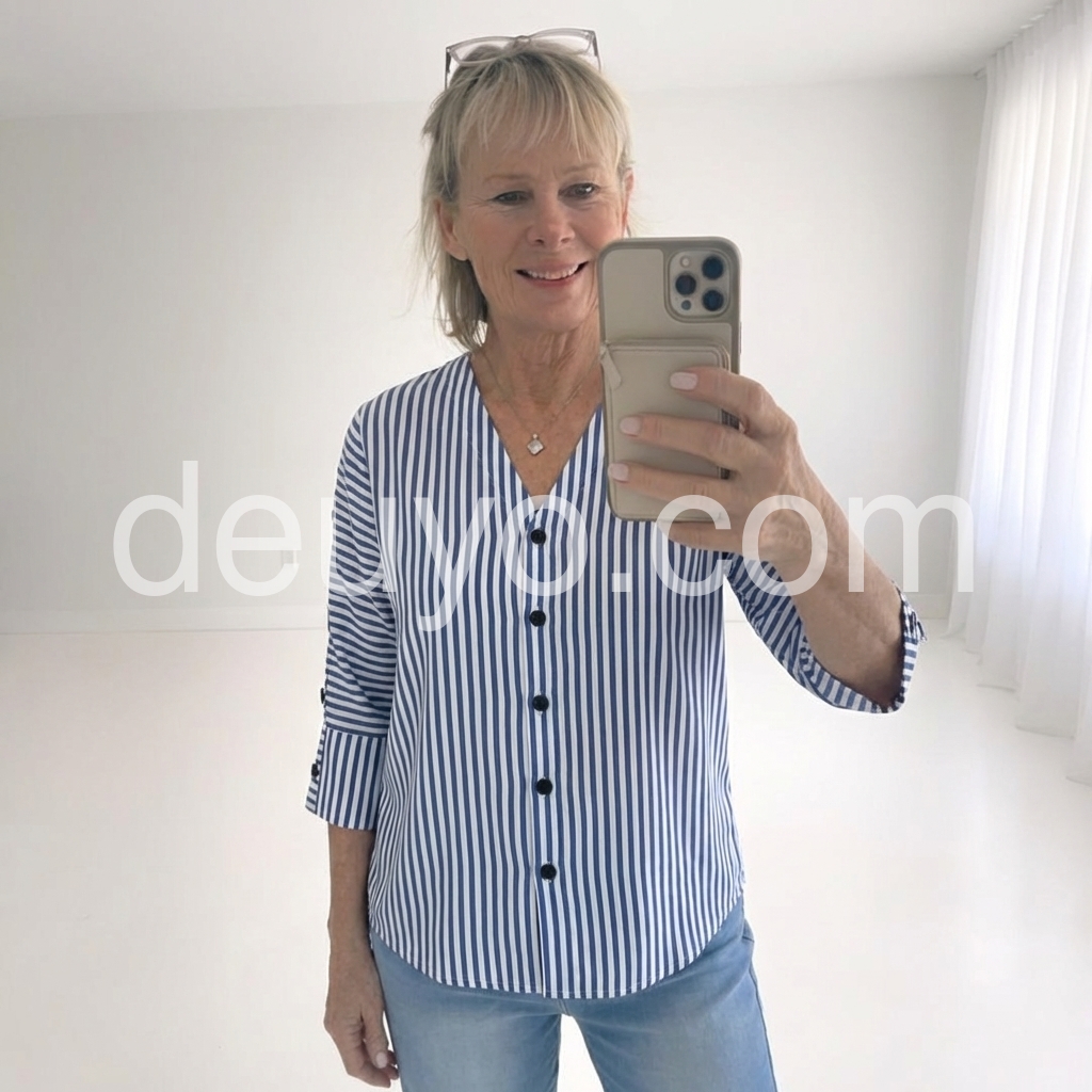 Absolutely love this top! The vertical blue and white stripes are so slimming and the V-neck is just the right depth. It looks great paired with my favorite jeans for a casual day out. The material feels lightweight and breathable too.