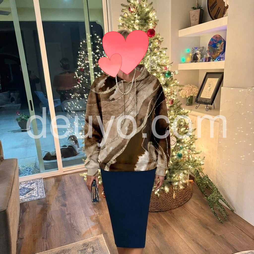 This hoodie is stunning! The fabric has a soft, velvety look, and the gold detailing gives it a really elegant, dressy feel. The drawstring hood and relaxed fit are comfortable, and the length is flattering when paired with jeans or leggings. It looks exactly like the photos and is perfect for holiday casual glam outfits. I’ve worn it a few times already and it still looks great.