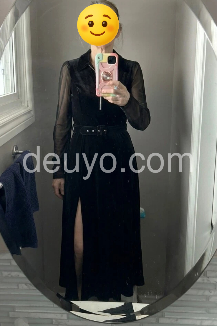 I absolutely love this dress! The black color is gorgeous and the fit is very flattering, especially with the waist belt. The front zipper/V-neck detail gives it a stylish look, and the long sleeves make it feel perfect for dressing up. The fabric hangs beautifully and the skirt has a nice flow. It looks just like the photos and feels high quality.