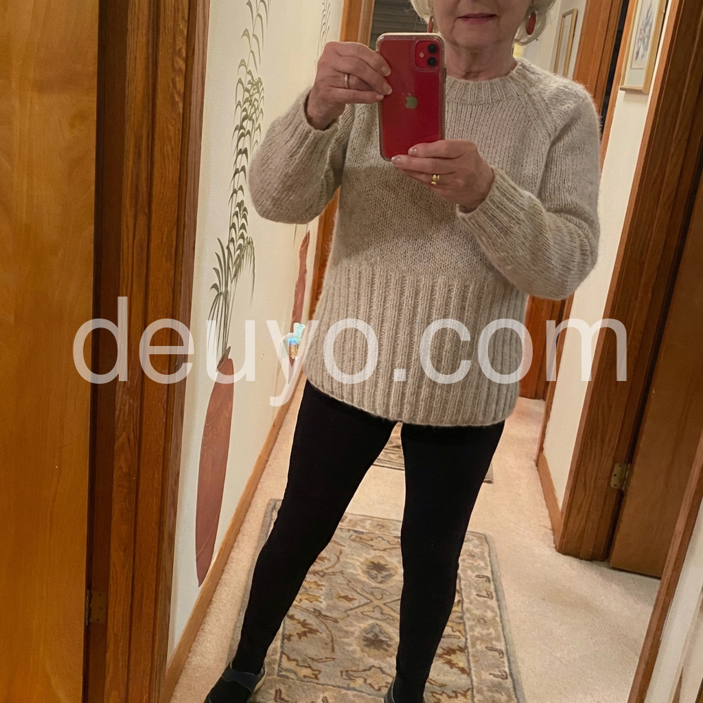 So cozy and warm! The material looks like a high-end alpaca or mohair blend. I was worried it might be itchy, but it is surprisingly soft against the skin. The raglan sleeves give it a nice casual drape.
