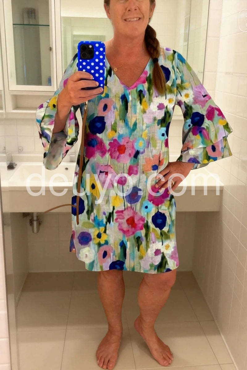 Love the bell sleeves on this dress. It is flowy without looking like a tent. Very comfortable and the fabric feels high quality.