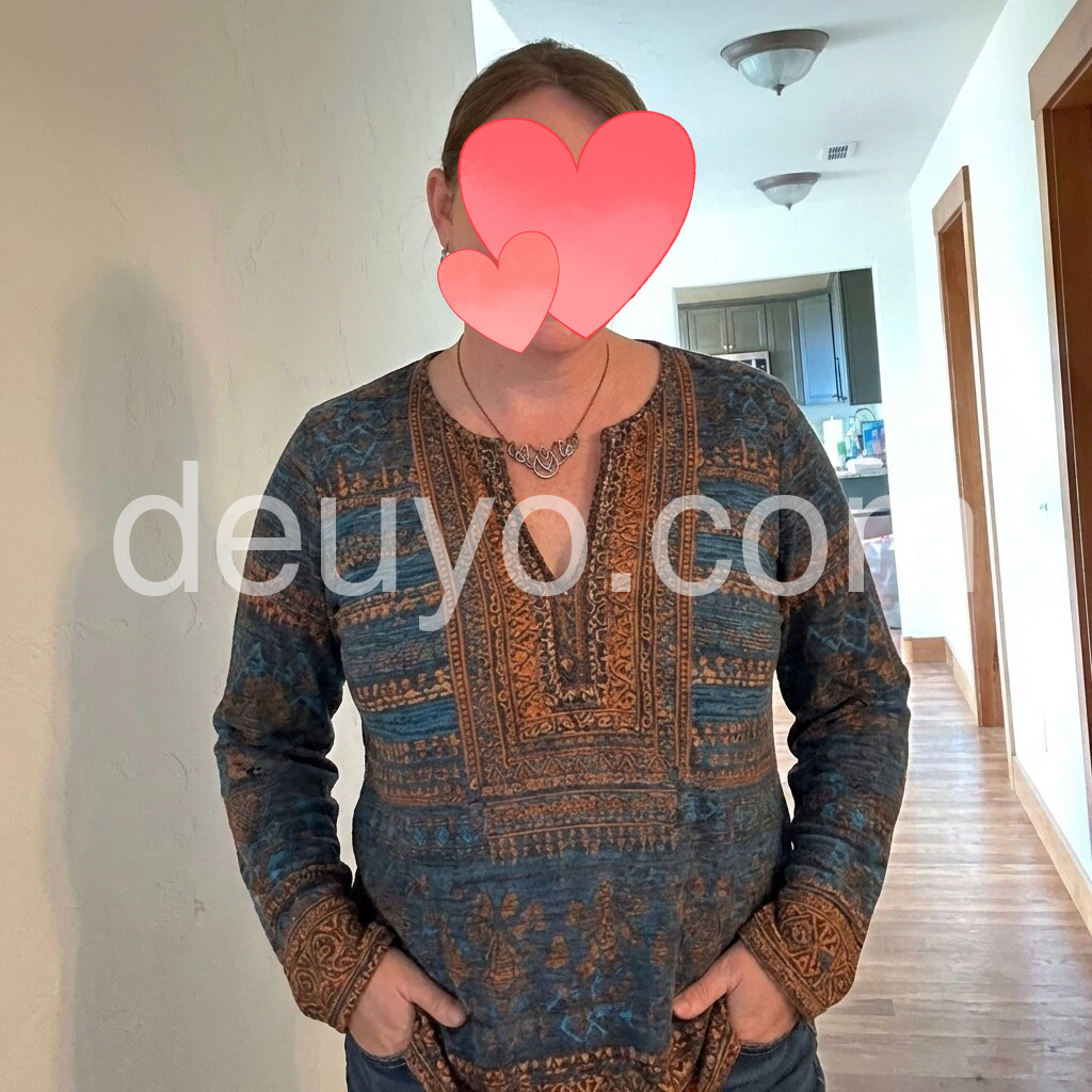I love this tunic! The navy blue color and the detailed boho print are even prettier in person. The V-neck with the buttons looks great and the long sleeves are a perfect fit. It’s comfortable, falls nicely, and is easy to style with jeans or leggings. Looks exactly like the photos.