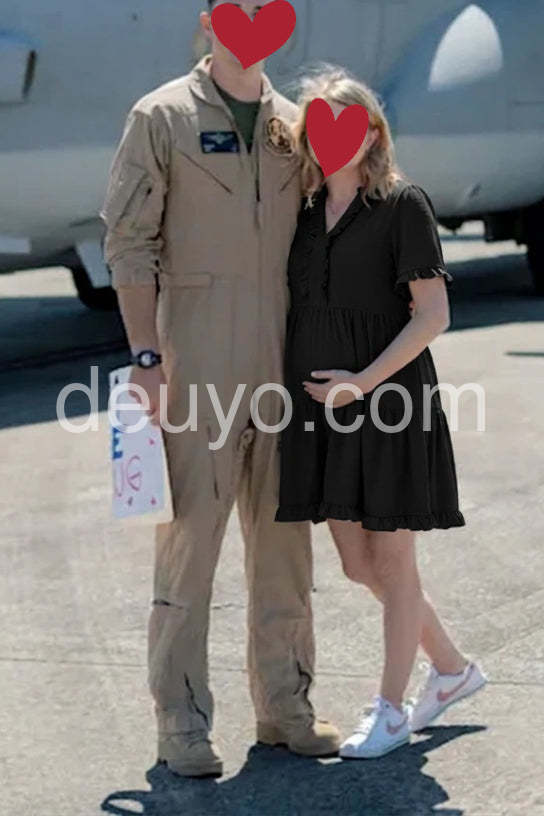 This black dress is so comfortable and flowy. I love the ruffle details around the v-neck. It fits perfectly and hides my tummy.